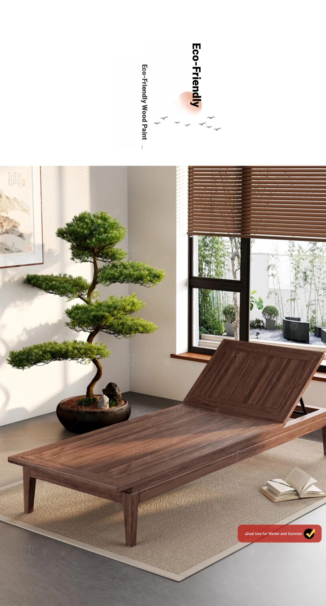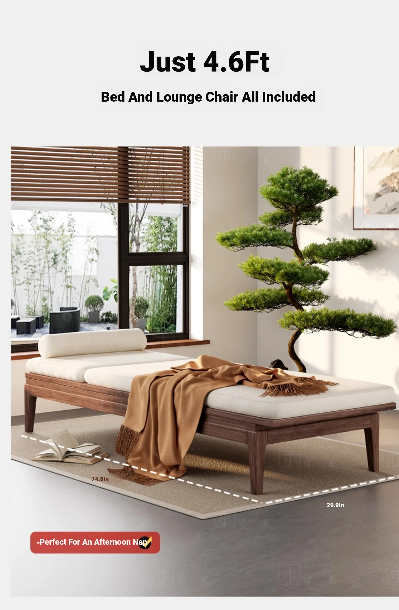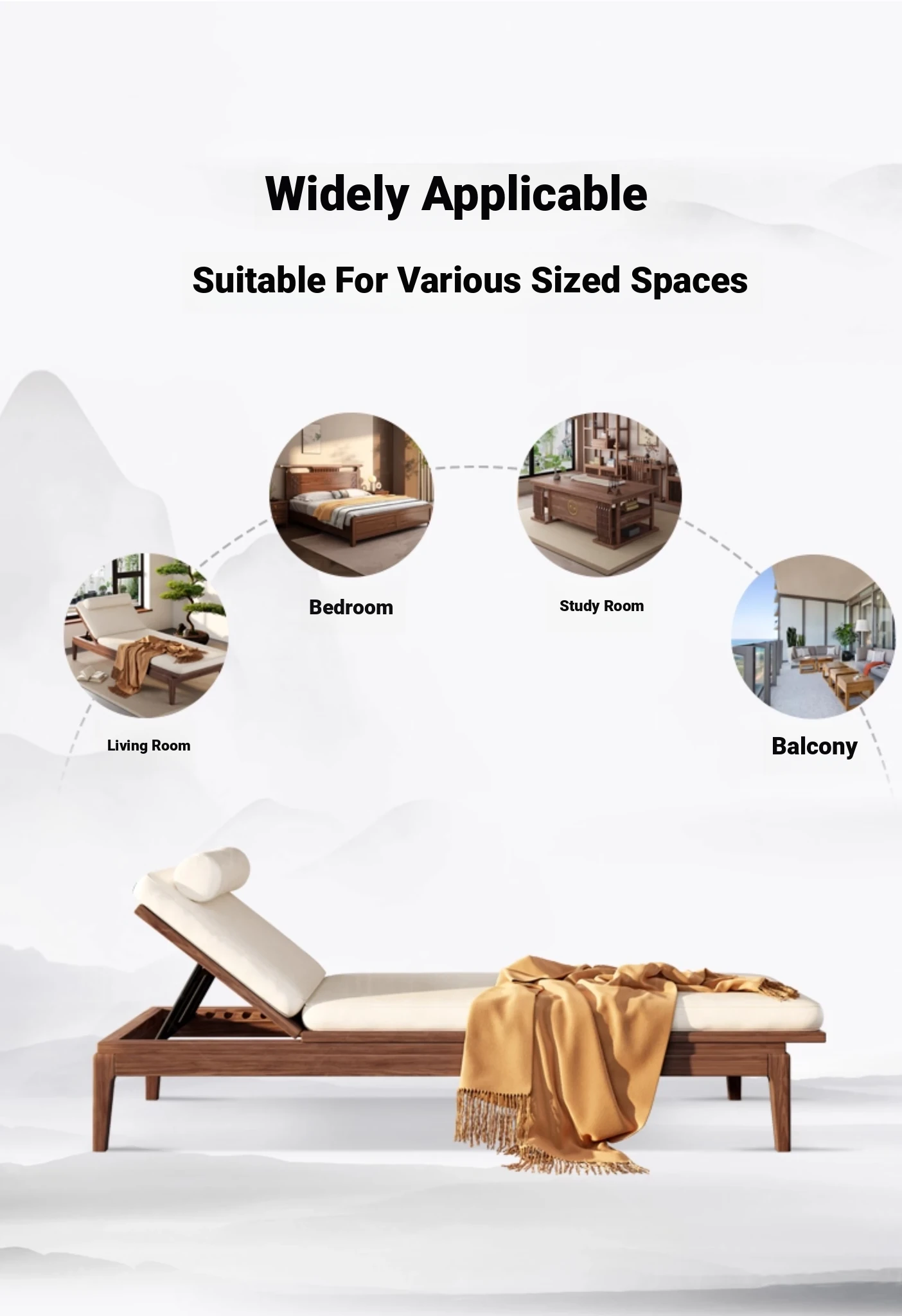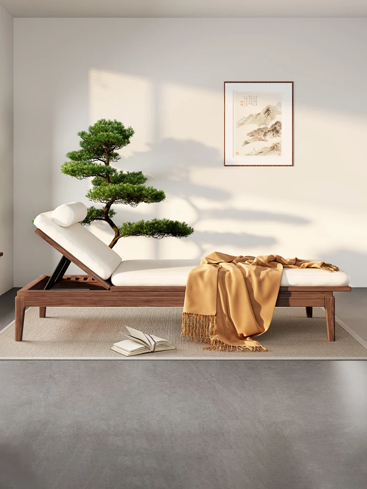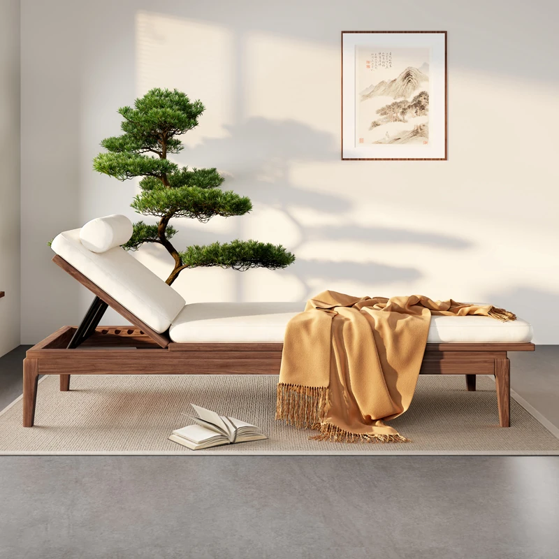 South American Walnut New Chinese Style Foldable Solid Wood Chaise Lounge Sofa Bed - Ideal for Relaxation in Bedrooms and Living Rooms
