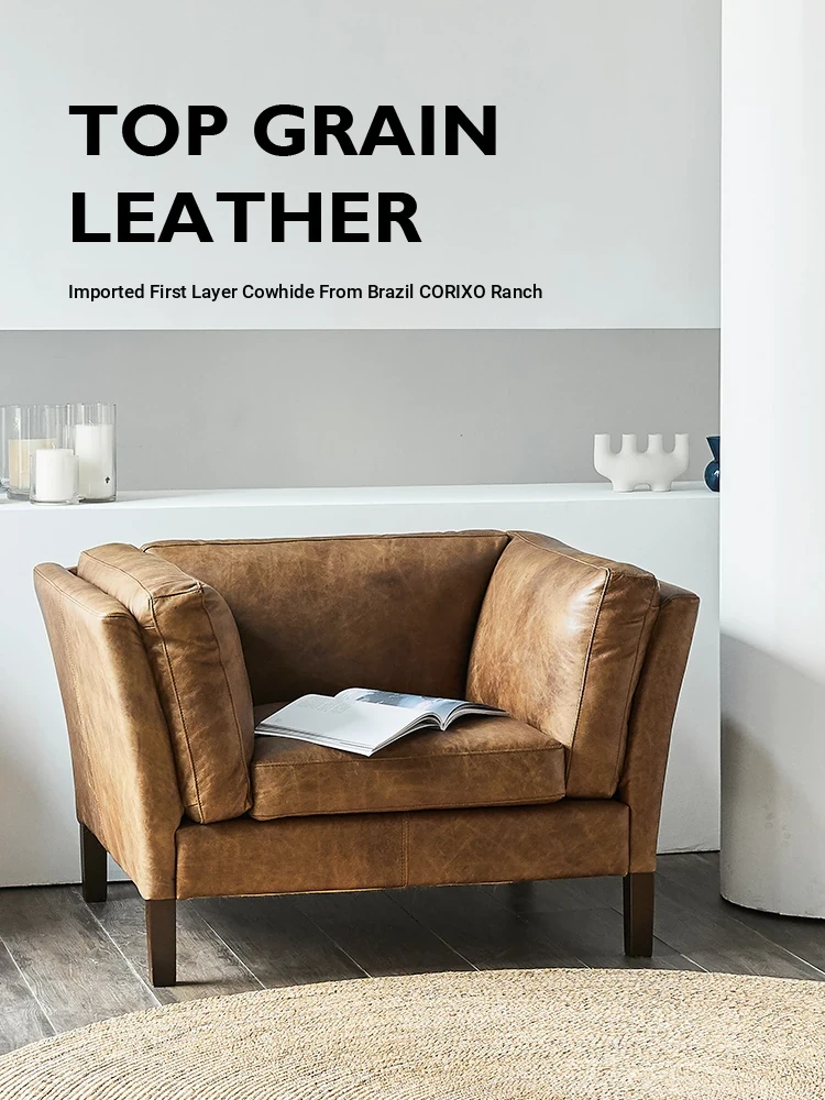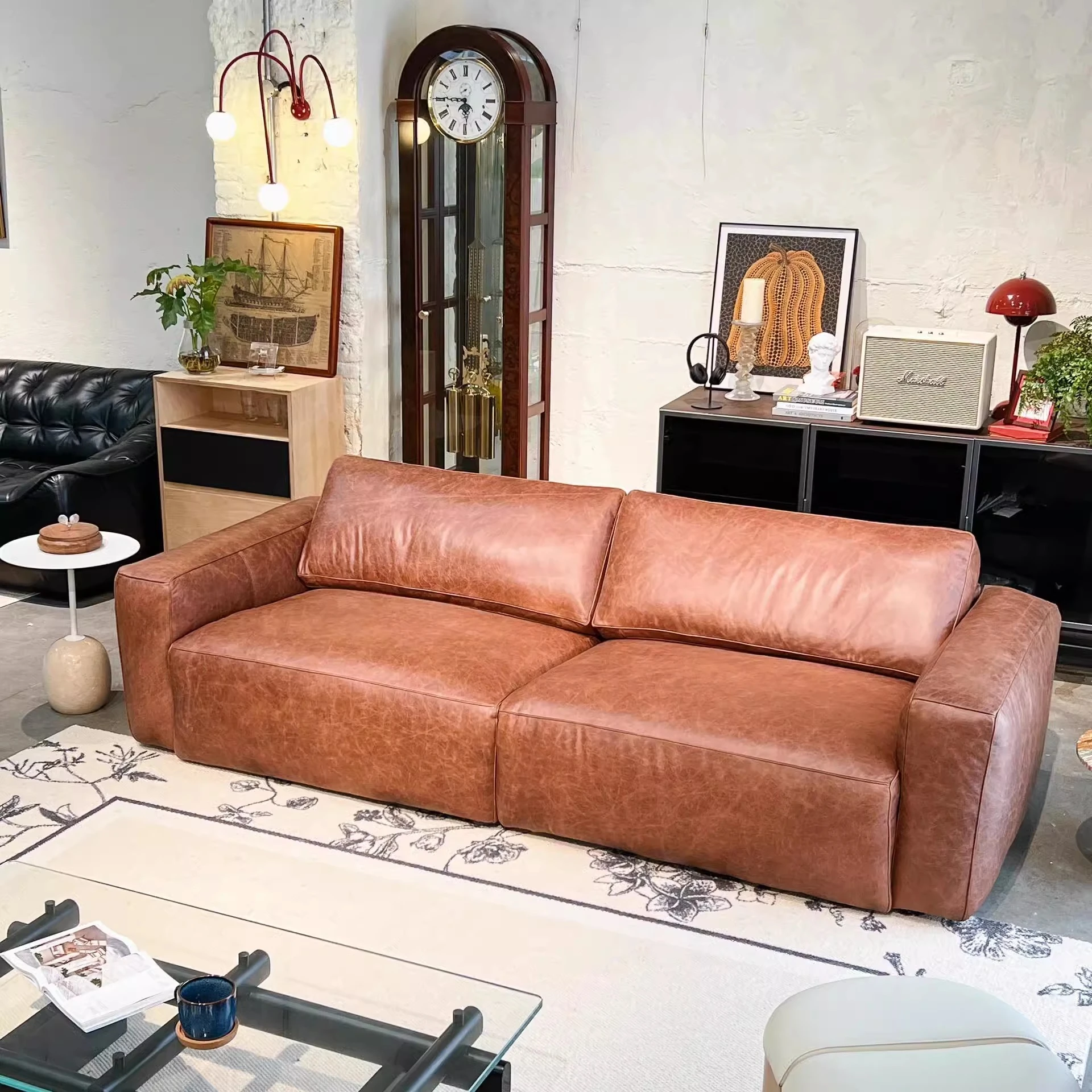 Vintage Genuine Leather Sofa - American Retro Distressed Waxed Leather for Villas and Small Living Rooms, Perfect for Combinations in Bars and Cigar Lounges