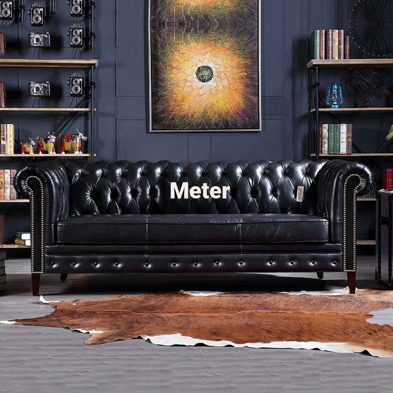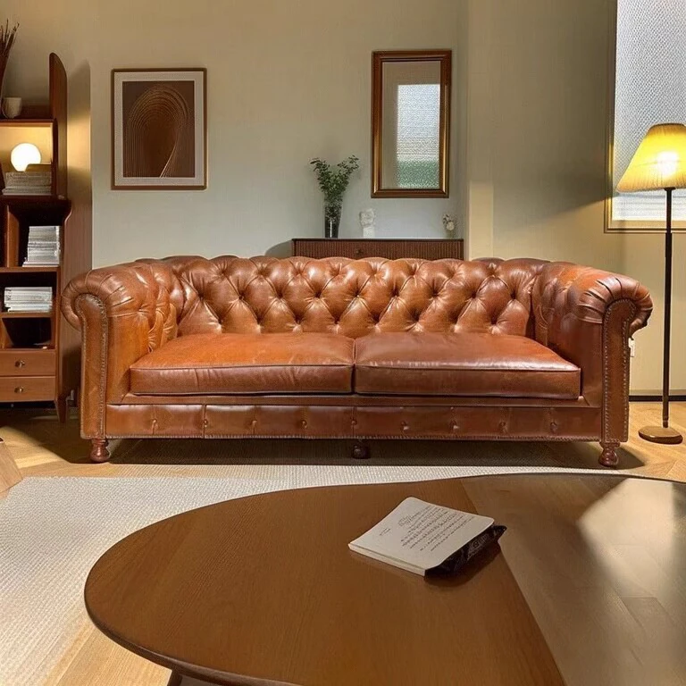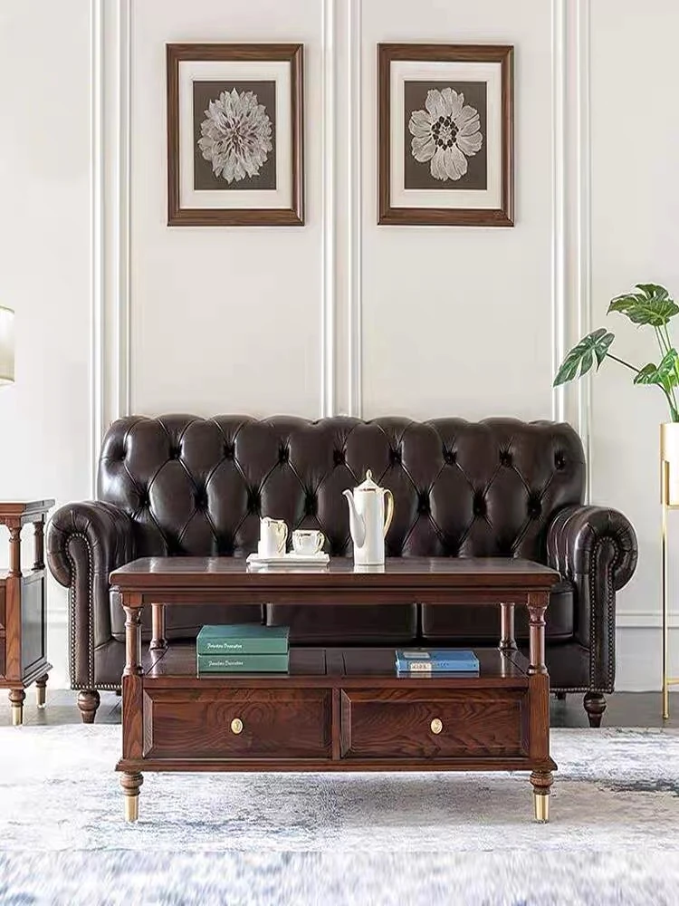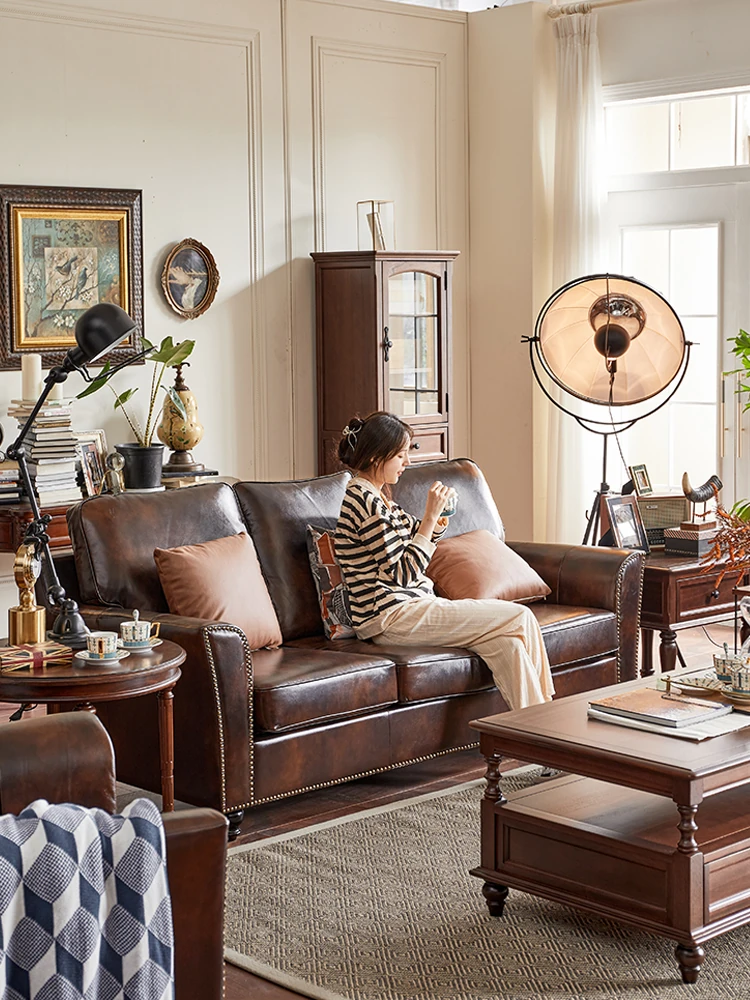 Vintage-Inspired American Luxury Genuine Leather Sofa for Small Living Rooms - Classic Retro Waxed Leather Design Perfect for Villas and Cigar Lounges