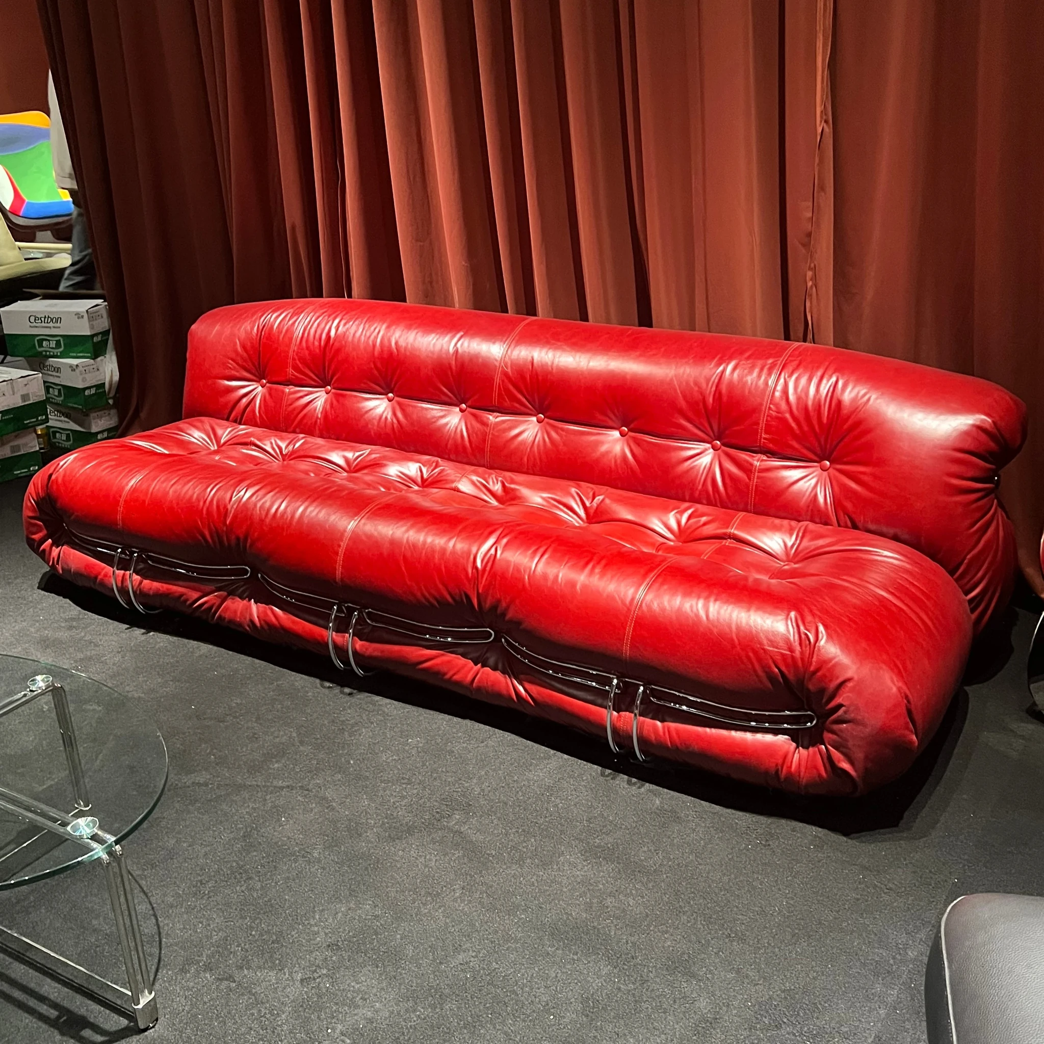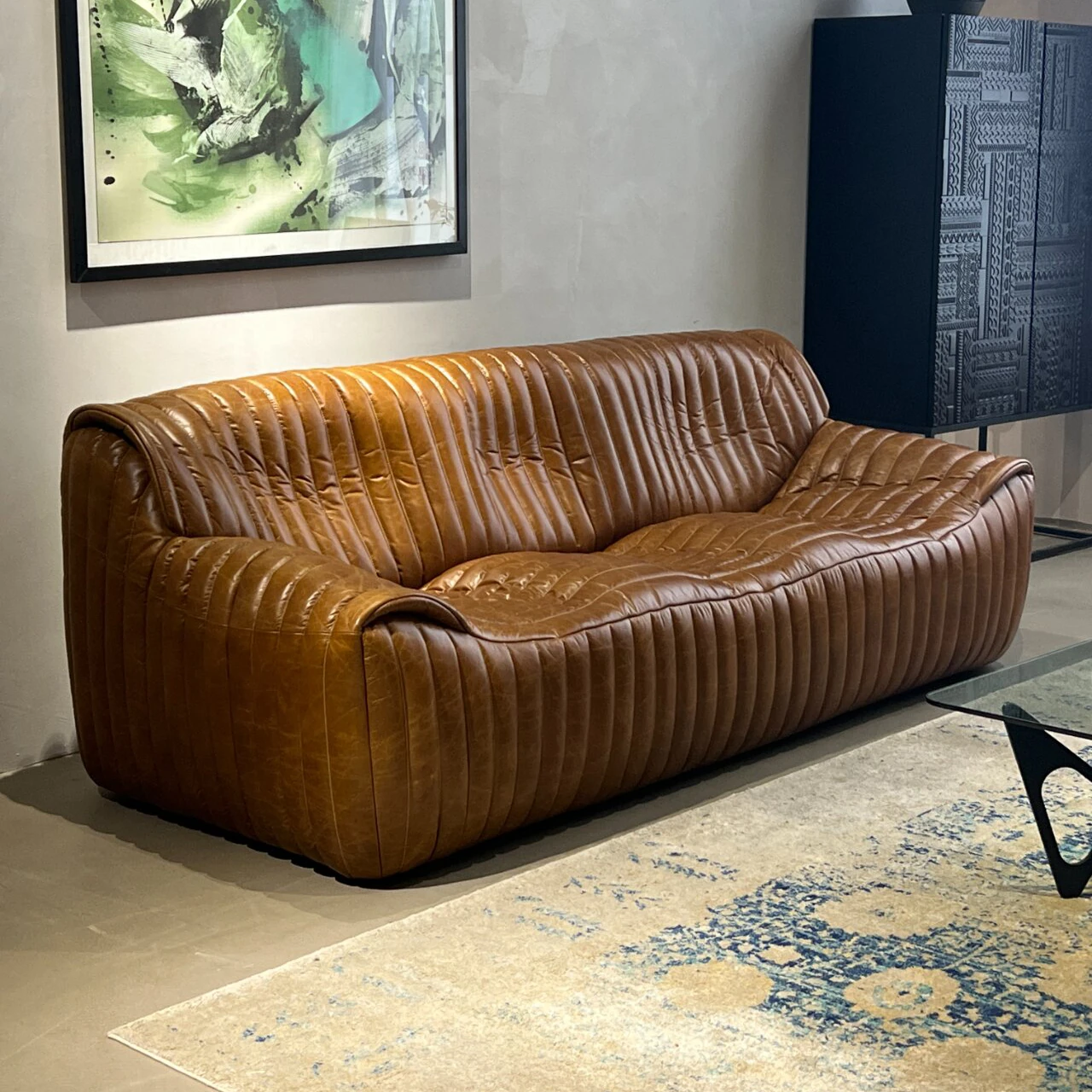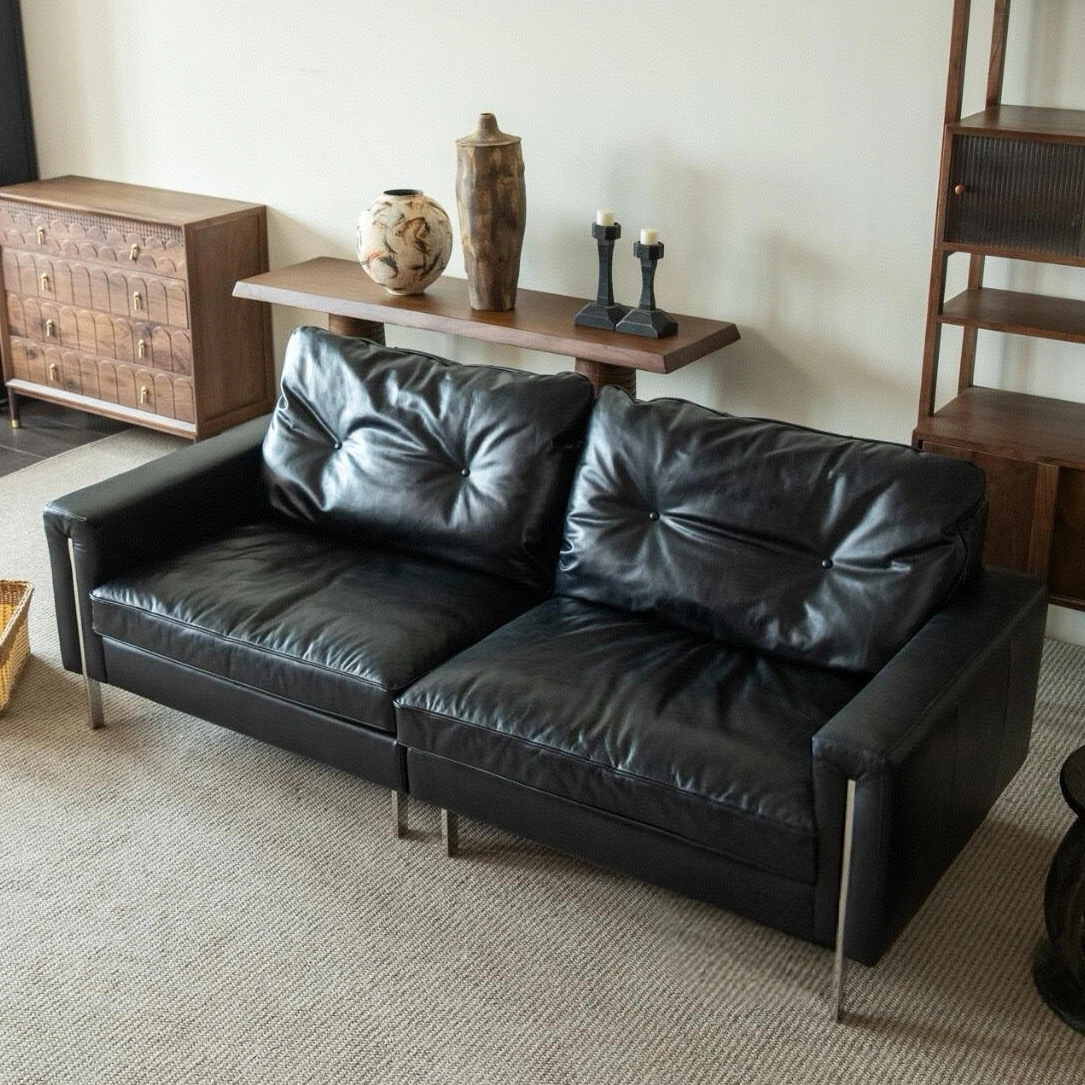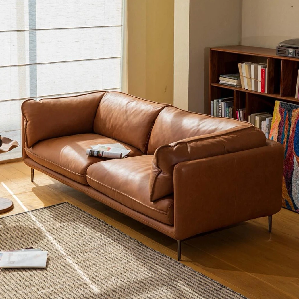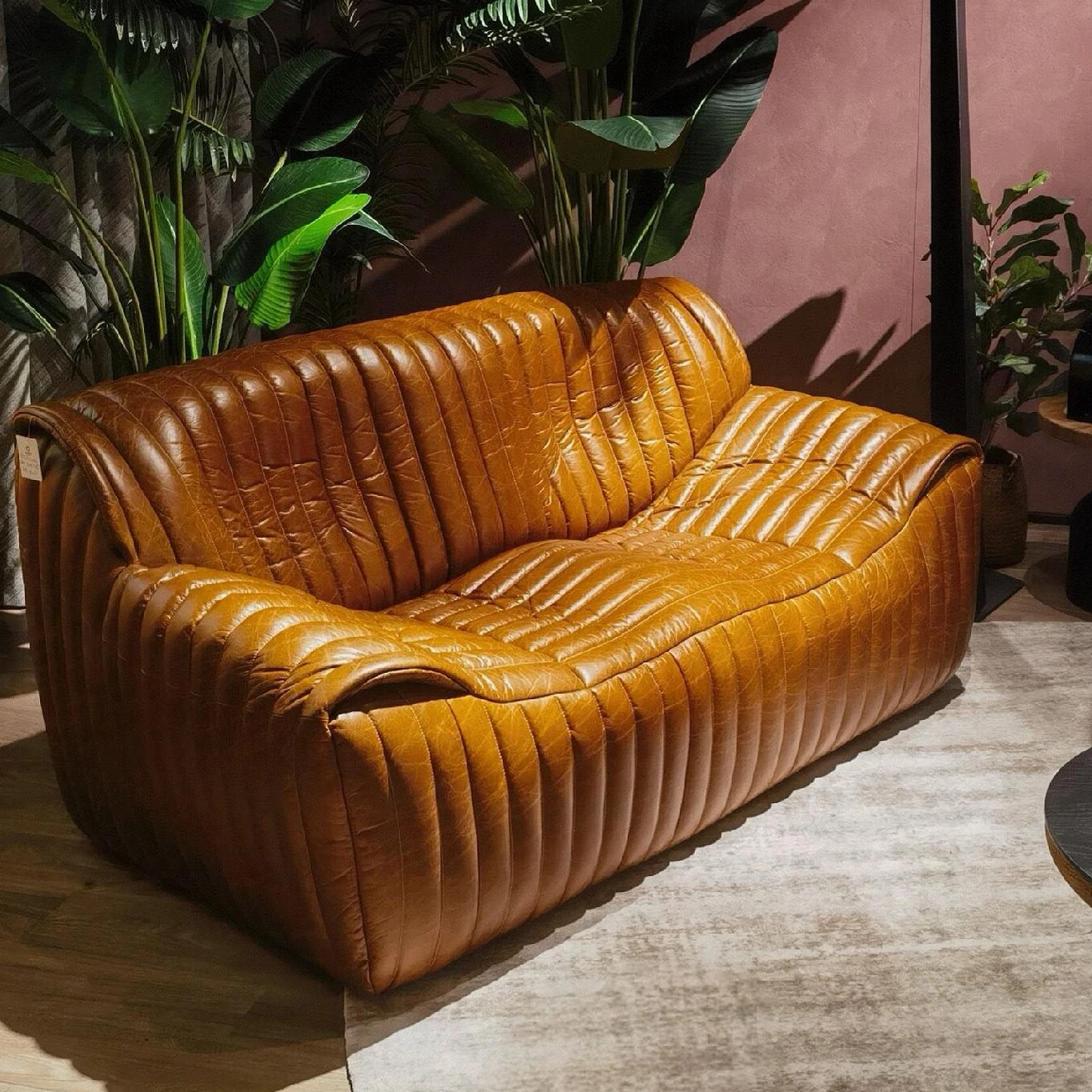 Vintage Wave Leather Sofa - Retro Genuine Leather Design for Living Room, Ideal for Cozy Airbnb Rentals with a Relaxed Pleated Look