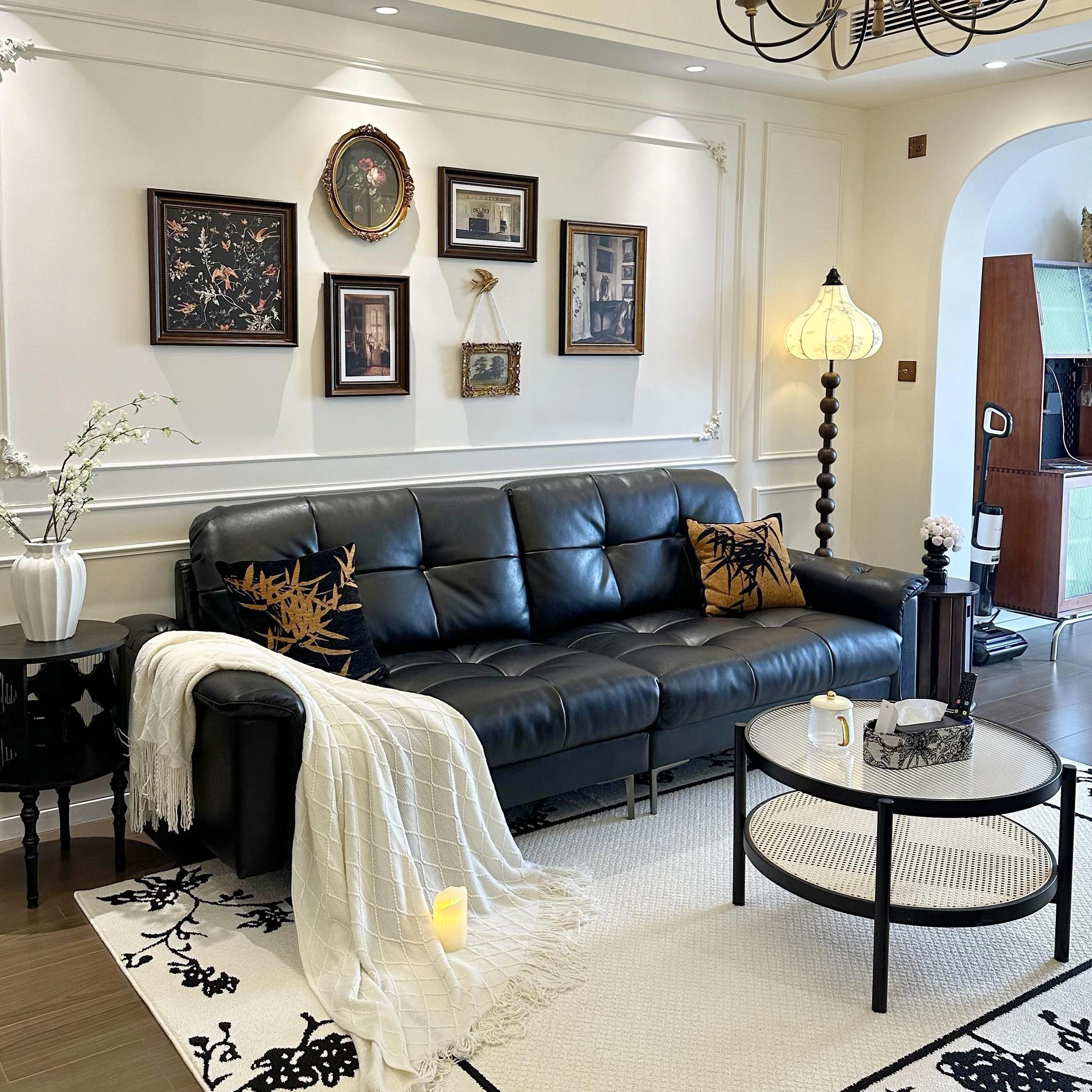 Vintage Black Waxed Leather Nebula Sofa - French Style Modular Straight Sofa for Living Room, 3-Seater for Villa Homes