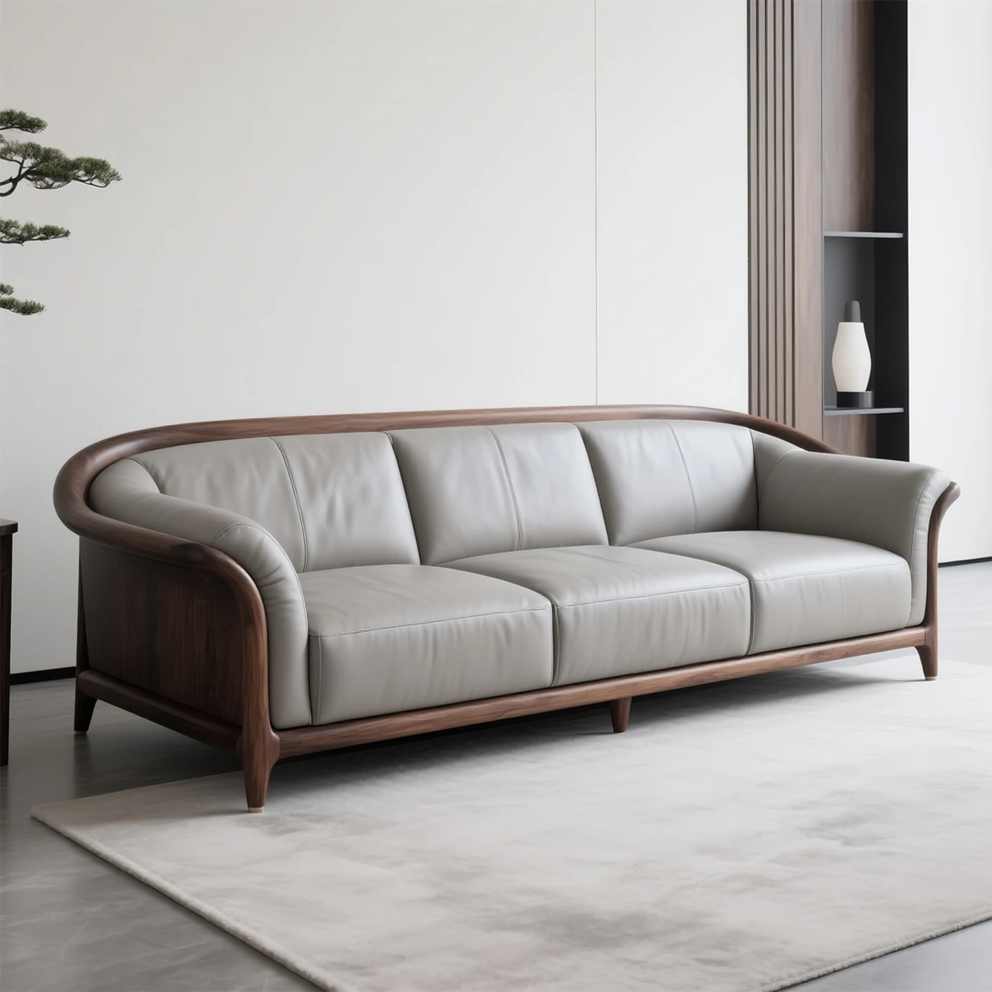 Modern Minimalist Light Luxury New Chinese Style Solid Black Walnut Sofa with Genuine Leather – Elegant High-End Design for Spacious Living Rooms