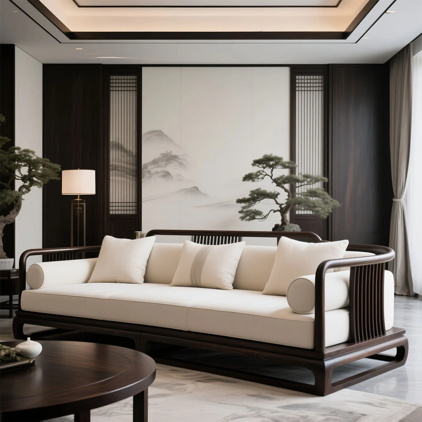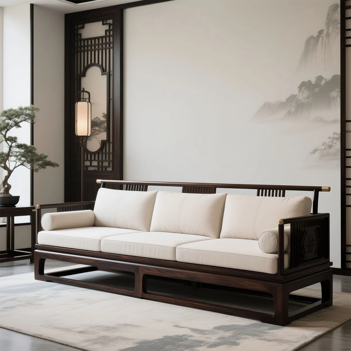 Modern Chinese-Style Black Gold Wood Sofa Set - Elegant Minimalist Zen Design for Villas and Spacious Living Rooms - Perfect for Any Home Size