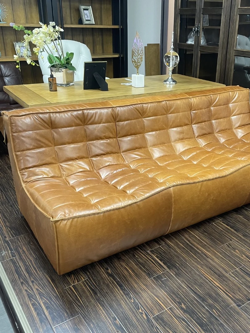 Vintage Style Genuine Leather Sofa - N701 Modern Retro Waffle Design Oil Wax Leather Lazy Modular Corner Set