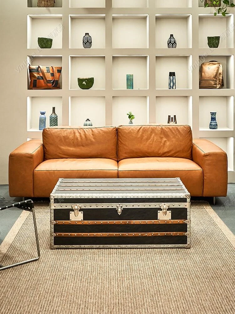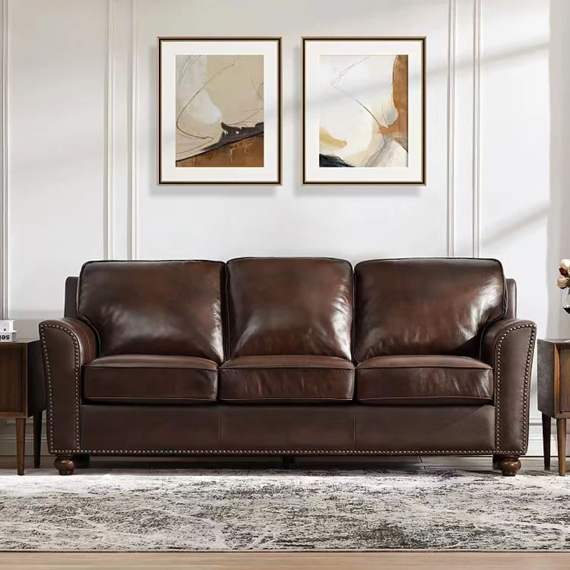 Vintage Retro Genuine Leather Sofa - Three-Seater Living Room Couch, Made with Top-Grain Cowhide and Oil-Wax Leather, Perfect for Villas and Elegant Interiors