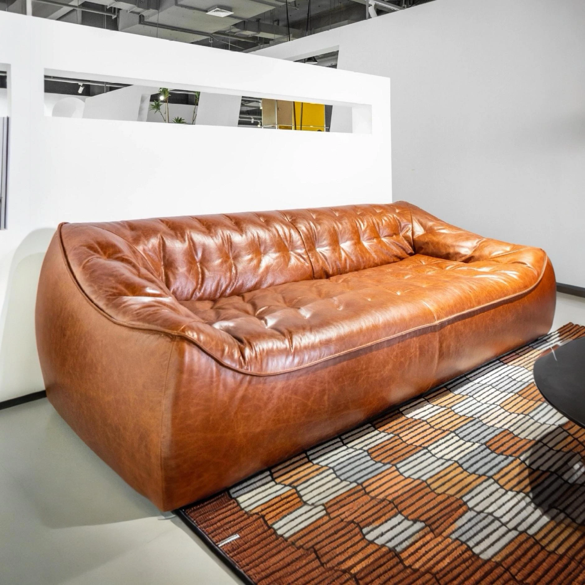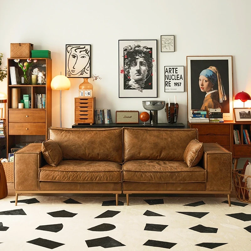 Vintage-Style Tofu Block Oil Wax Leather Sofa - Retro Modular Design for Living Room and Villa, Perfect for Spacious Homes and Elegant Interiors