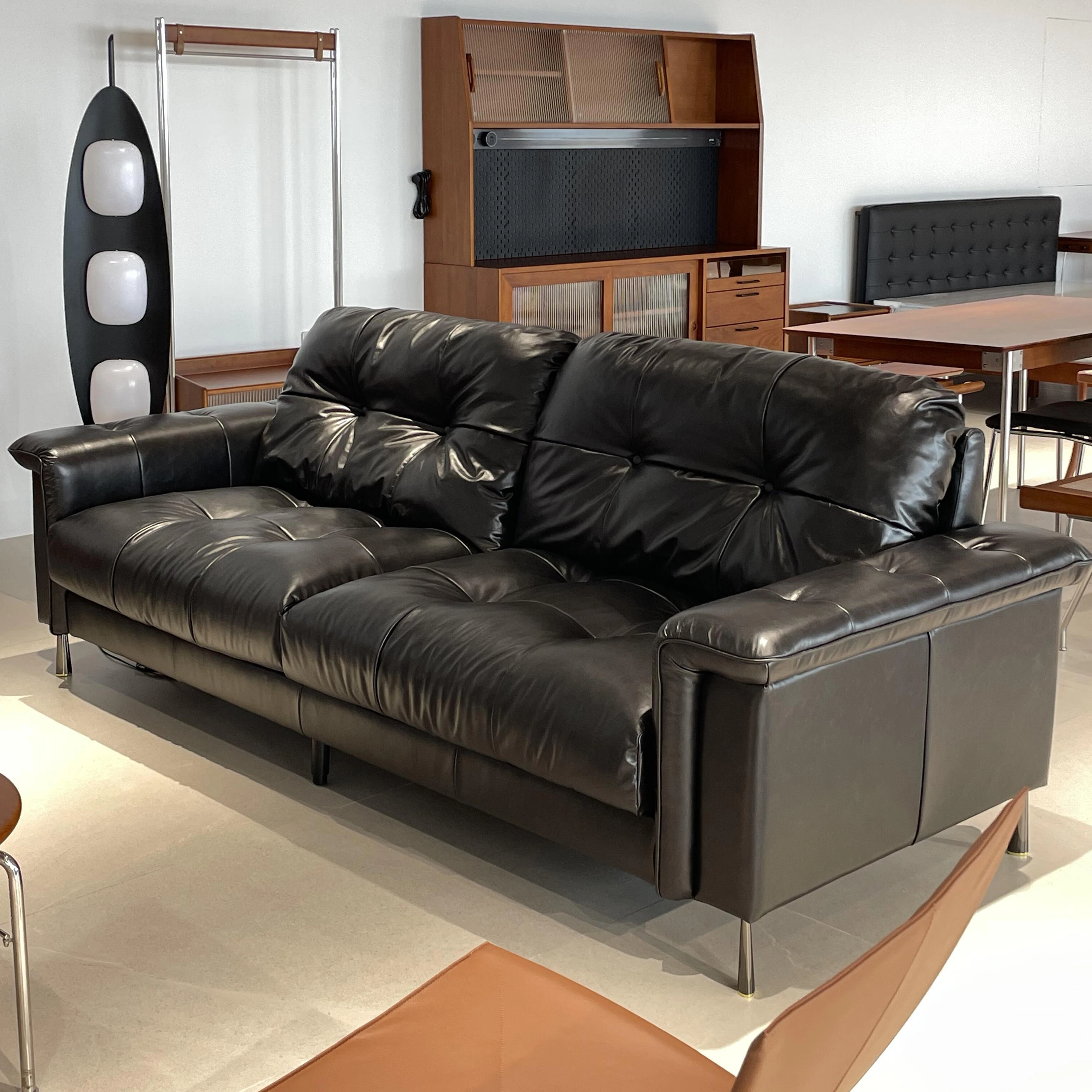 Vintage Black Waxed Leather Nebula Sofa - Retro Designer Three-Seat Living Room Couch for Stylish Interiors