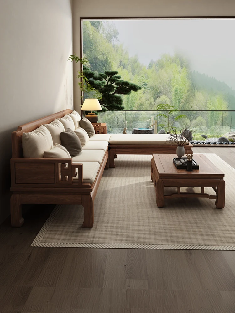 South American Walnut New Chinese Style Solid Wood Corner Sofa with Chaise Lounge - Perfect for Small Living Rooms, 2025 New Arrival
