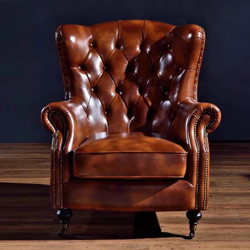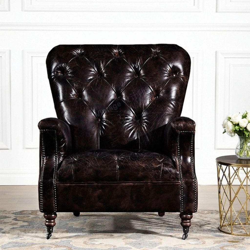 Vintage Genuine Leather Tiger Chair - American Retro Single Sofa with Tufted Design, Perfect for Whiskey and Cigar Lounge Relaxation