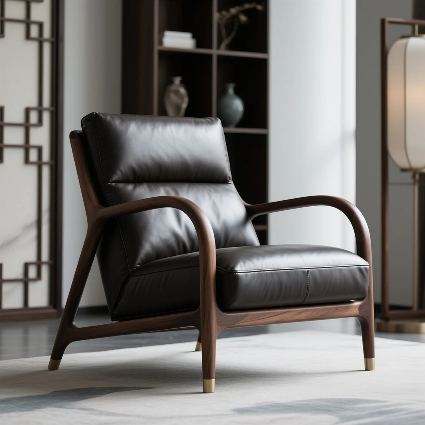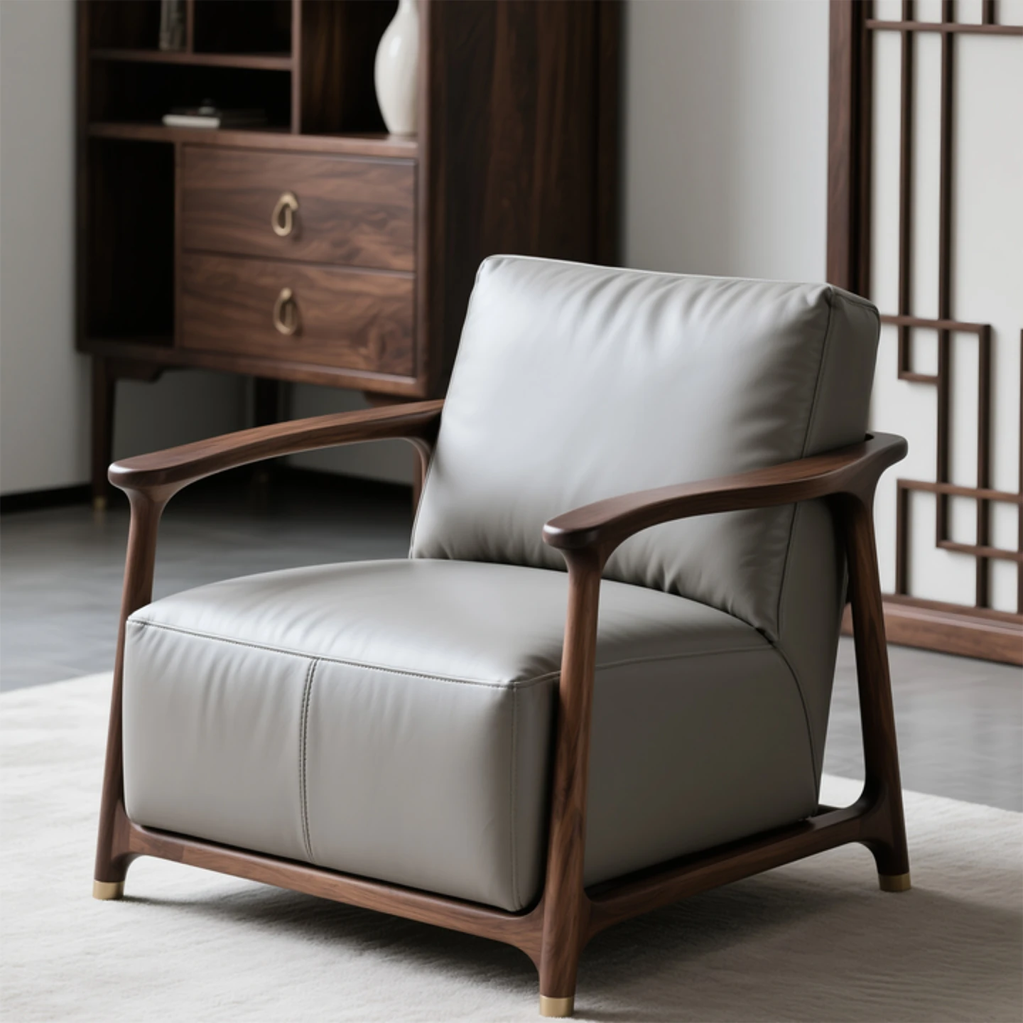 Elegant North American Black Walnut Solid Wood Armchair with Genuine Leather – Modern Minimalist High-End New Chinese Style Lounge Chair for Living Room Furniture