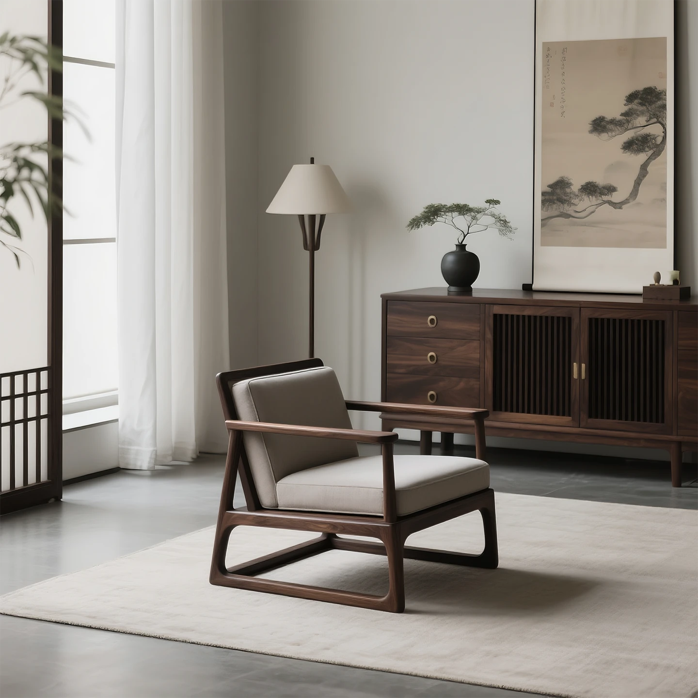 新中式デザインの北米産ブラックウォールナット製リラックスチェア|一人掛けソファ|高級ヴィラ向け|無垢材使用|会議や茶室での使用に最適なスタイリッシュなサロンチェア!