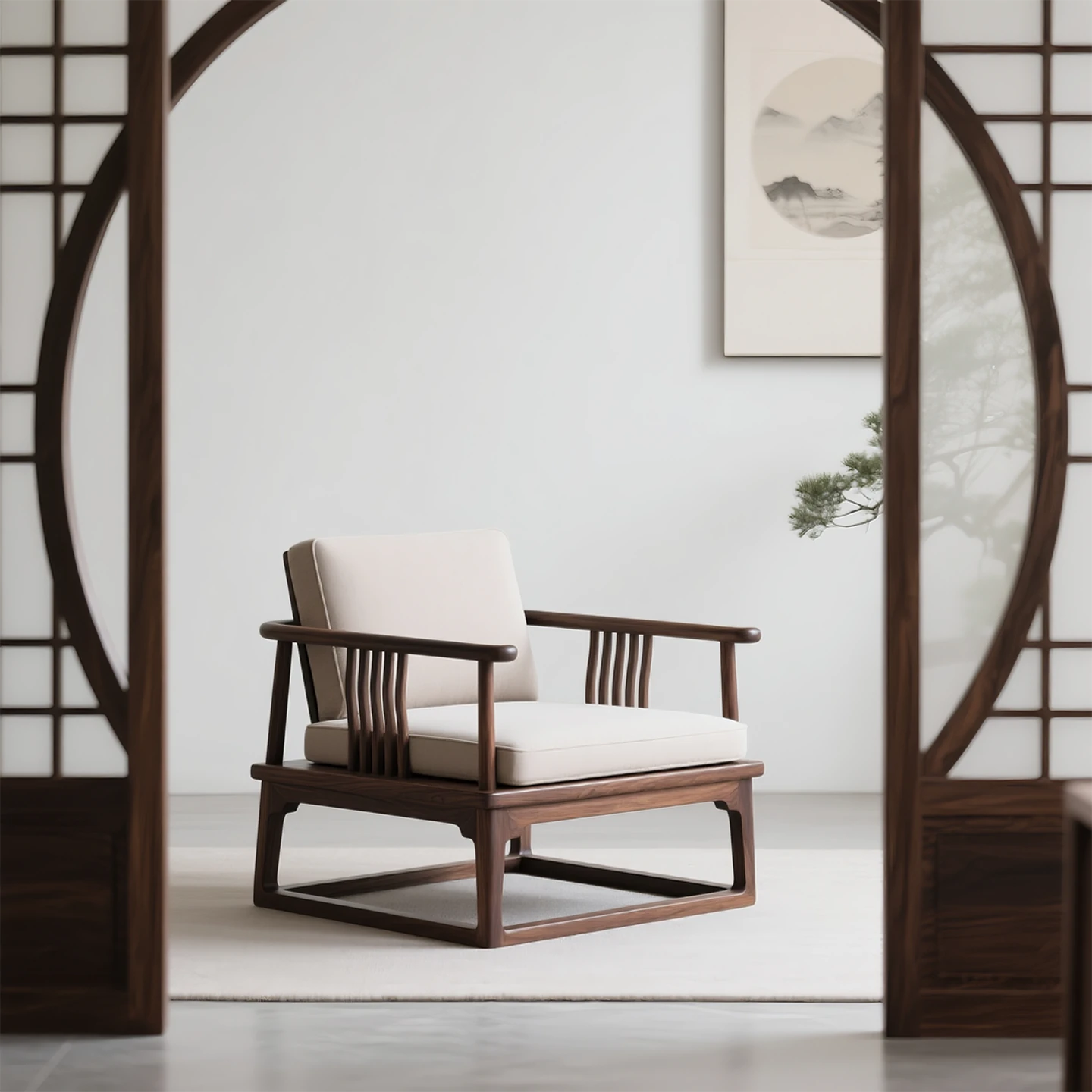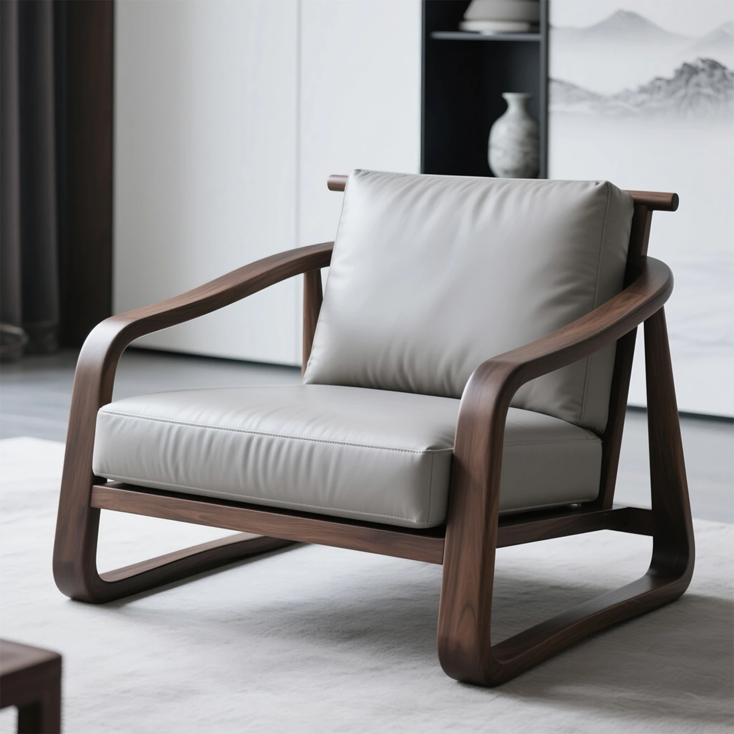 新中式のウォールナット製ソファチェア - 禅の雰囲気を楽しむリラックススペースに最適な、実木製のラウンジチェア。商談や接待にもぴったりな、心地よいくつろぎを提供します。