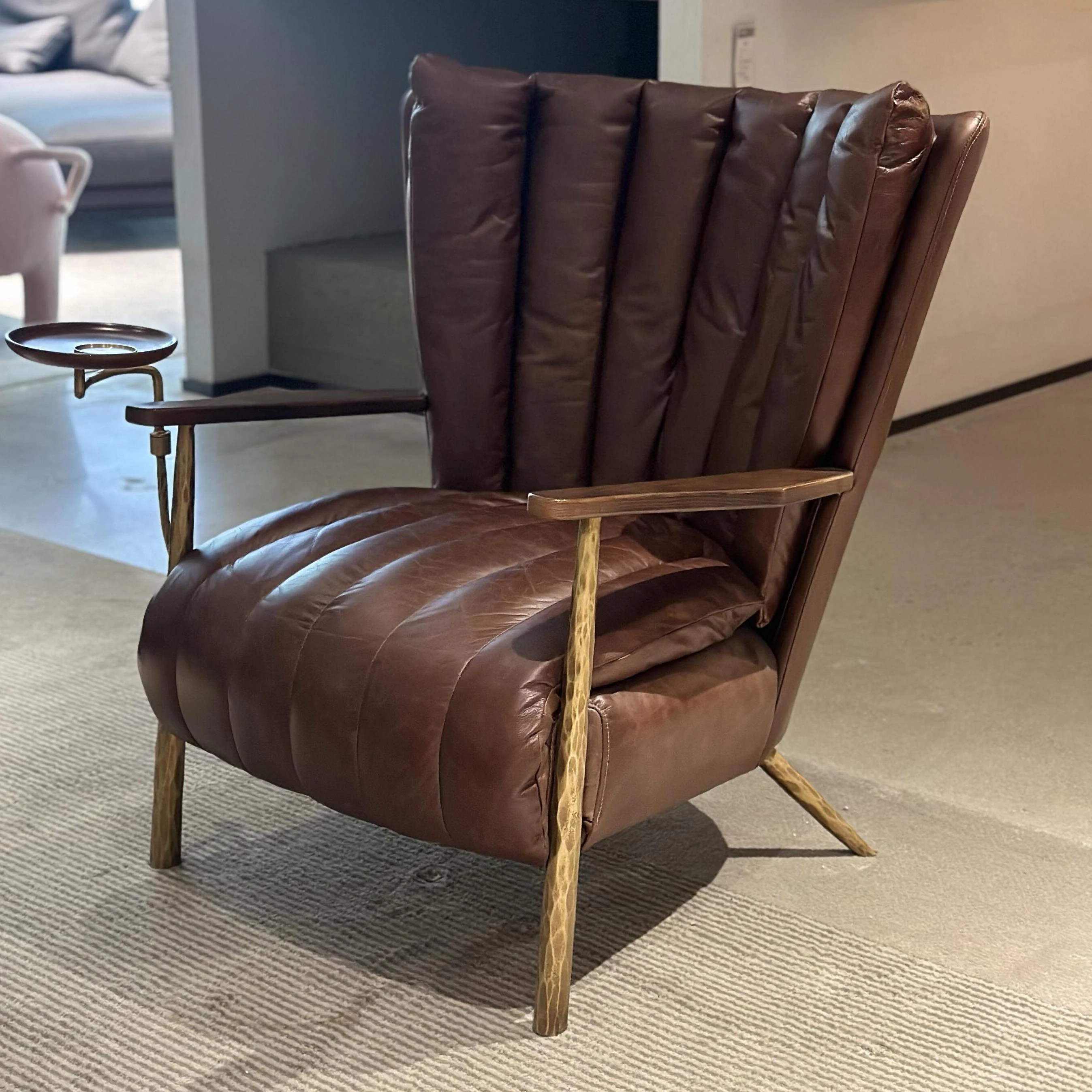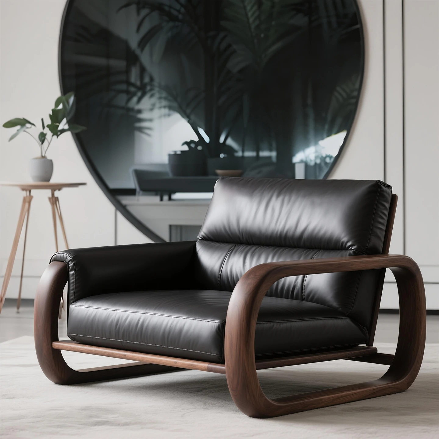 北米産ブラックウォールナットの本革デザインソファチェア - ラグジュアリーな一人掛けリビングチェア、優雅な背もたれ付きで高級感あふれる空間を演出。