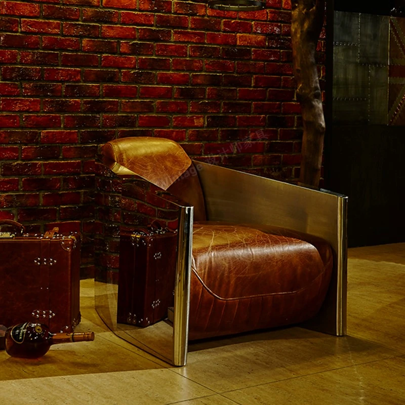 ヴィンテージ風カジュアルチェア、レトロオイルワックスレザーとインダストリアルデザインのアルミニウム製クリエイティブ一人用ソファチェア。金属アートの魅力を感じる、スタイリッシュなインテリアに最適!