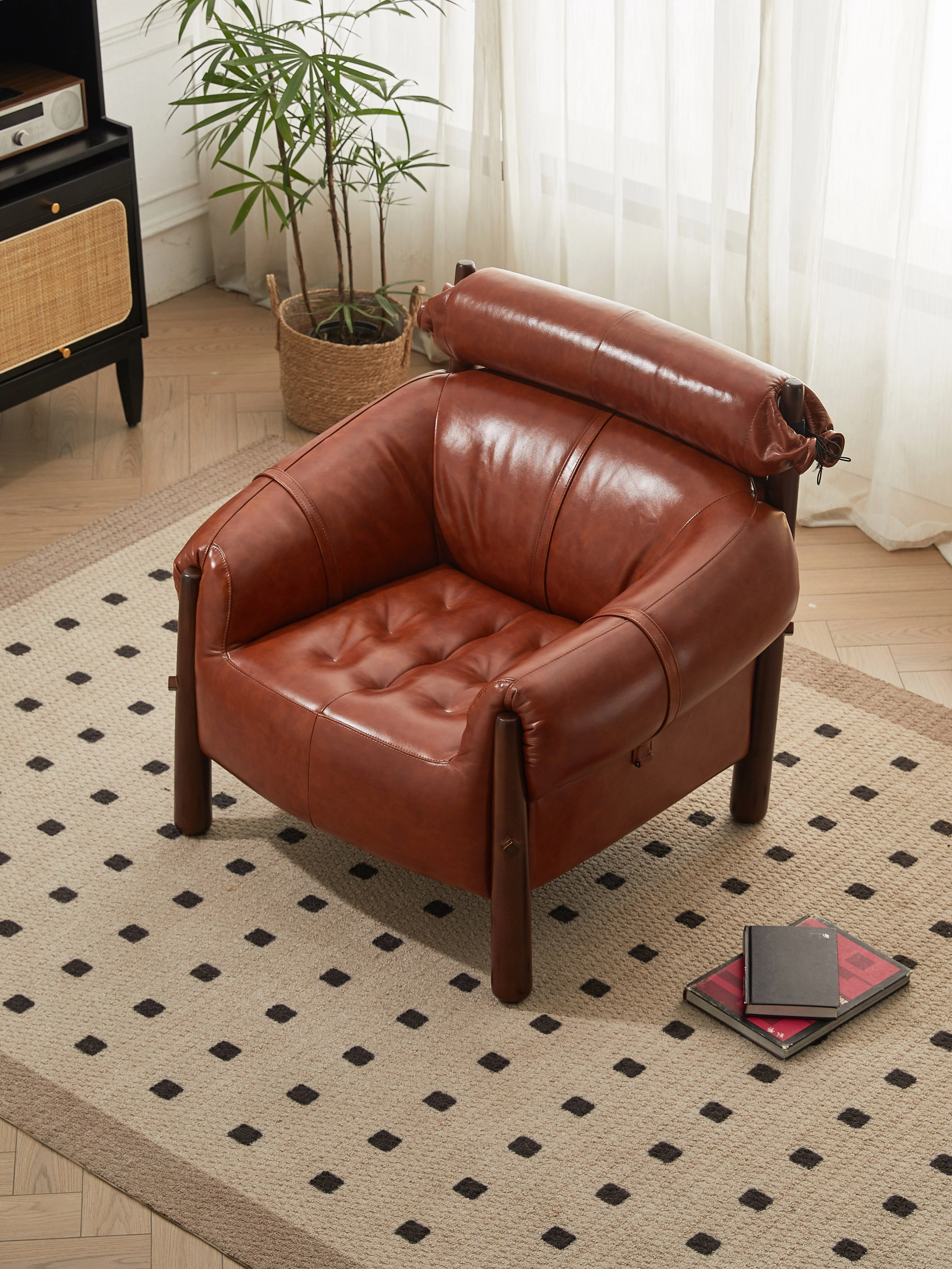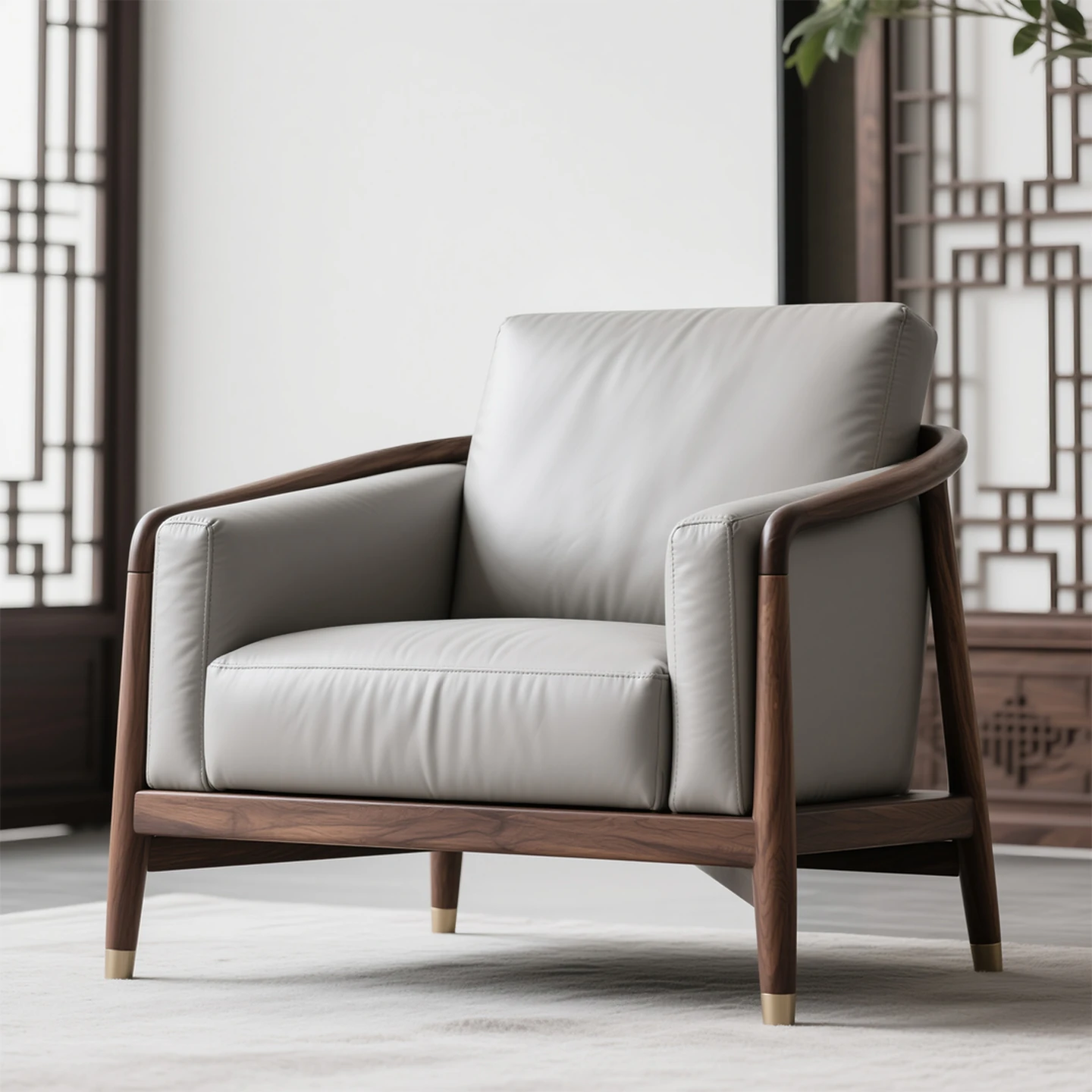 北米産ブラックウォルナットの新中式リラックスチェア|高級デザイナーの本革使用|シックなクラシックスタイルの一人掛けソファチェアで、優雅な空間を演出します。