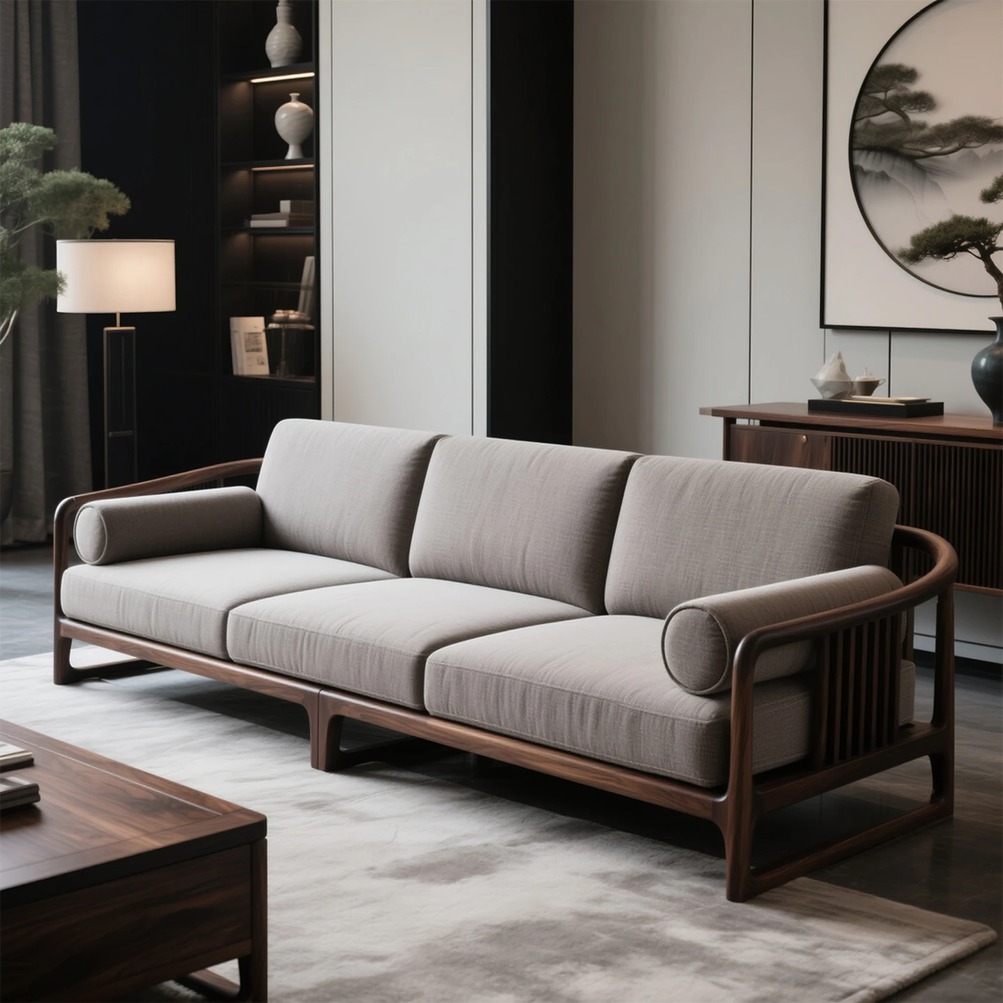 新中式デザインの北米産ブラックウォールナット無垢材ソファセット - 高級感溢れる広々とした現代ヴィラのリビングにぴったりなファブリックソファ!