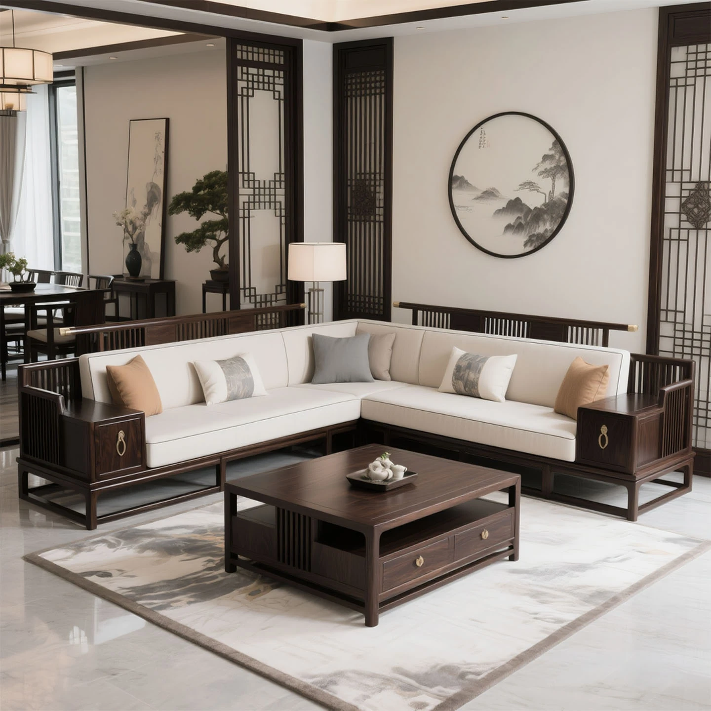 新中式スタイルのウッディコーナーソファセット - 現代的な別荘リビングに最適な禅の雰囲気を持つ高級無垢材家具。大小さまざまな部屋にぴったり!心安らぐ空間を演出します。