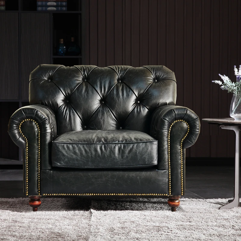 ヴィンテージ風アメリカンスタイル本革ソファー - クラシックなオイルワックスレザー使用、別荘やウィスキー・シガーバーにぴったり!優雅なデザインで居心地の良い空間を演出します。