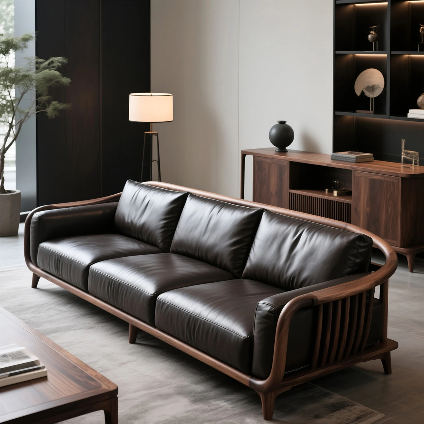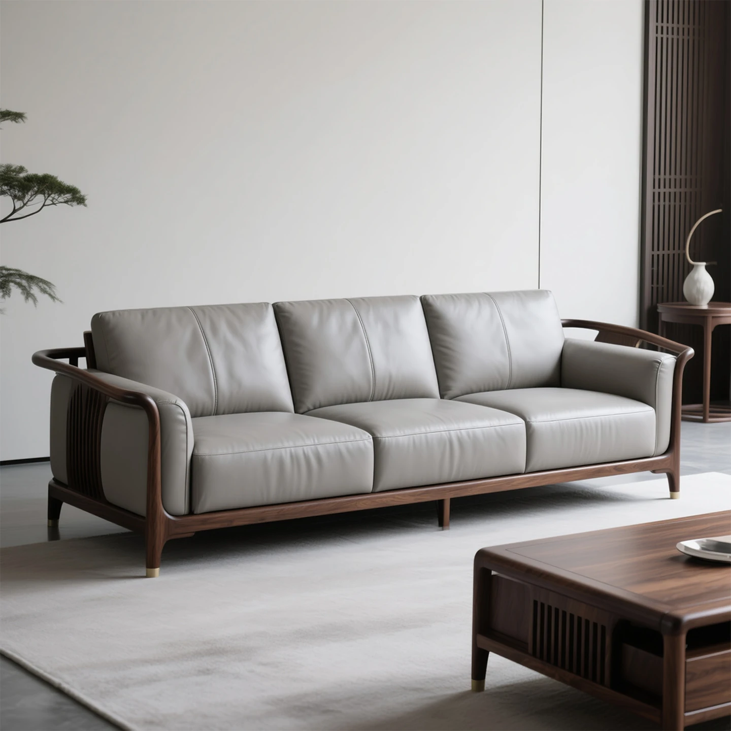 2025年新作!高級北米ウォールナット材使用の新中式デザイン、リビングにぴったりな本革製3人掛けソファ。スタイリッシュでありながら、快適さも追求した一品です。おしゃれなリビングを演出します!