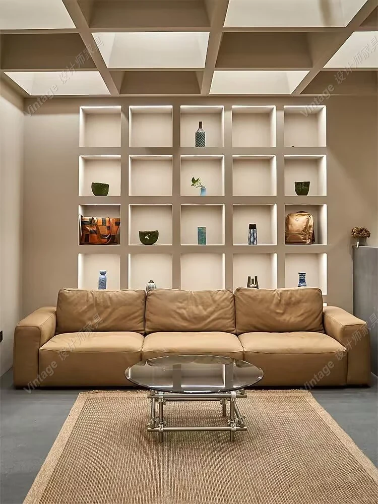 フランス風ヴィンテージ本革ソファ 小型リビングに最適 レトロオイルワックスレザー 豆腐ブロックモジュラーコーナー家具