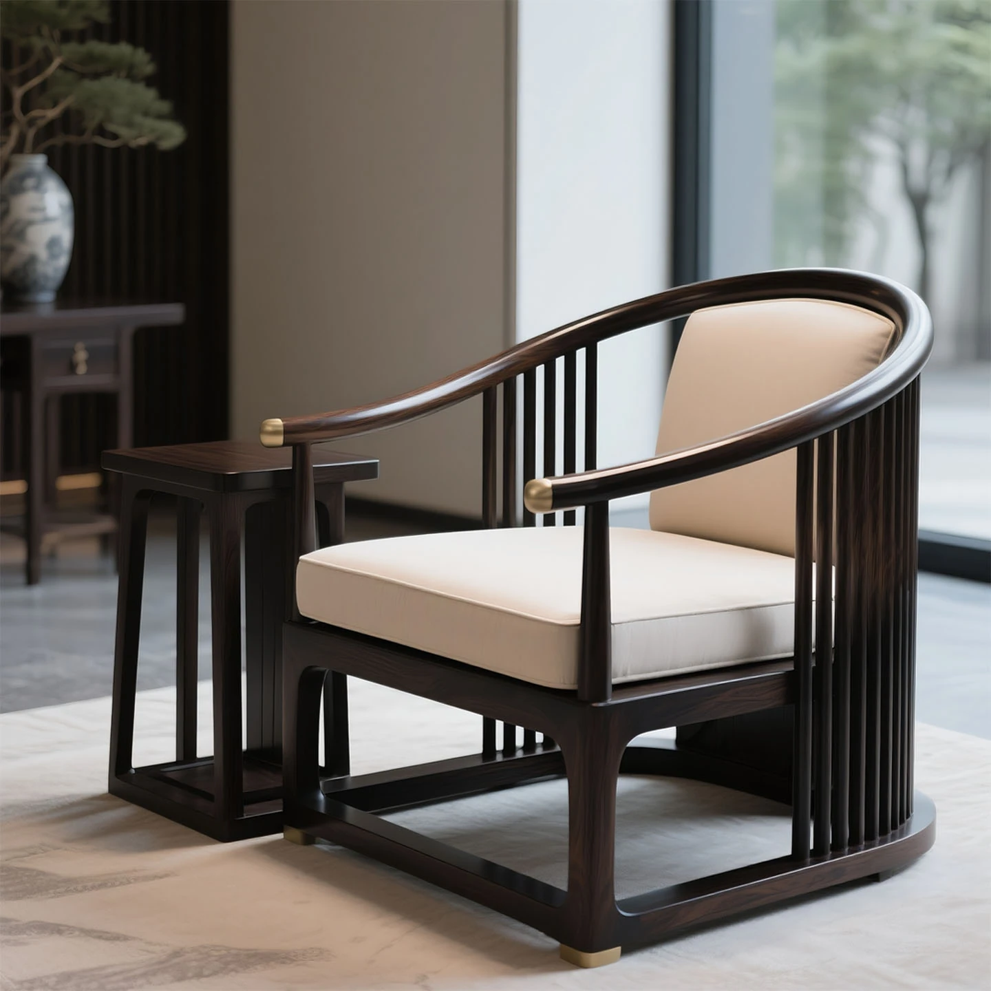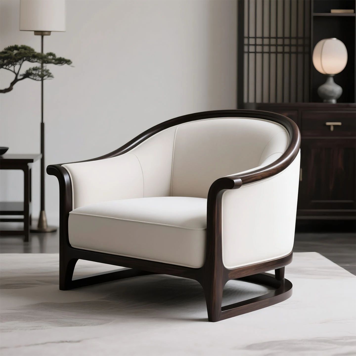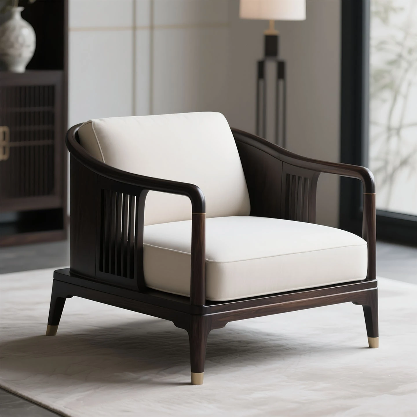 新中式侘寂スタイルのシングルソファ椅子 - ウッディなブラックウッドと布製のデザインが魅力的!バルコニーや寝室、リビングに最適なリラックス空間を演出します。快適な一人用のリラックスチェアで、心地よいひとときをお楽しみください!