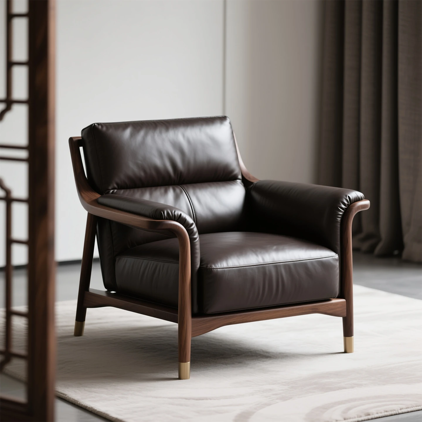 北米産ブラックウォールナット無垢材使用!高級感あふれる本革ソファチェア。シンプルで洗練されたデザインの新中式リビング用リラックスチェア。あなたの空間を格上げする逸品です!