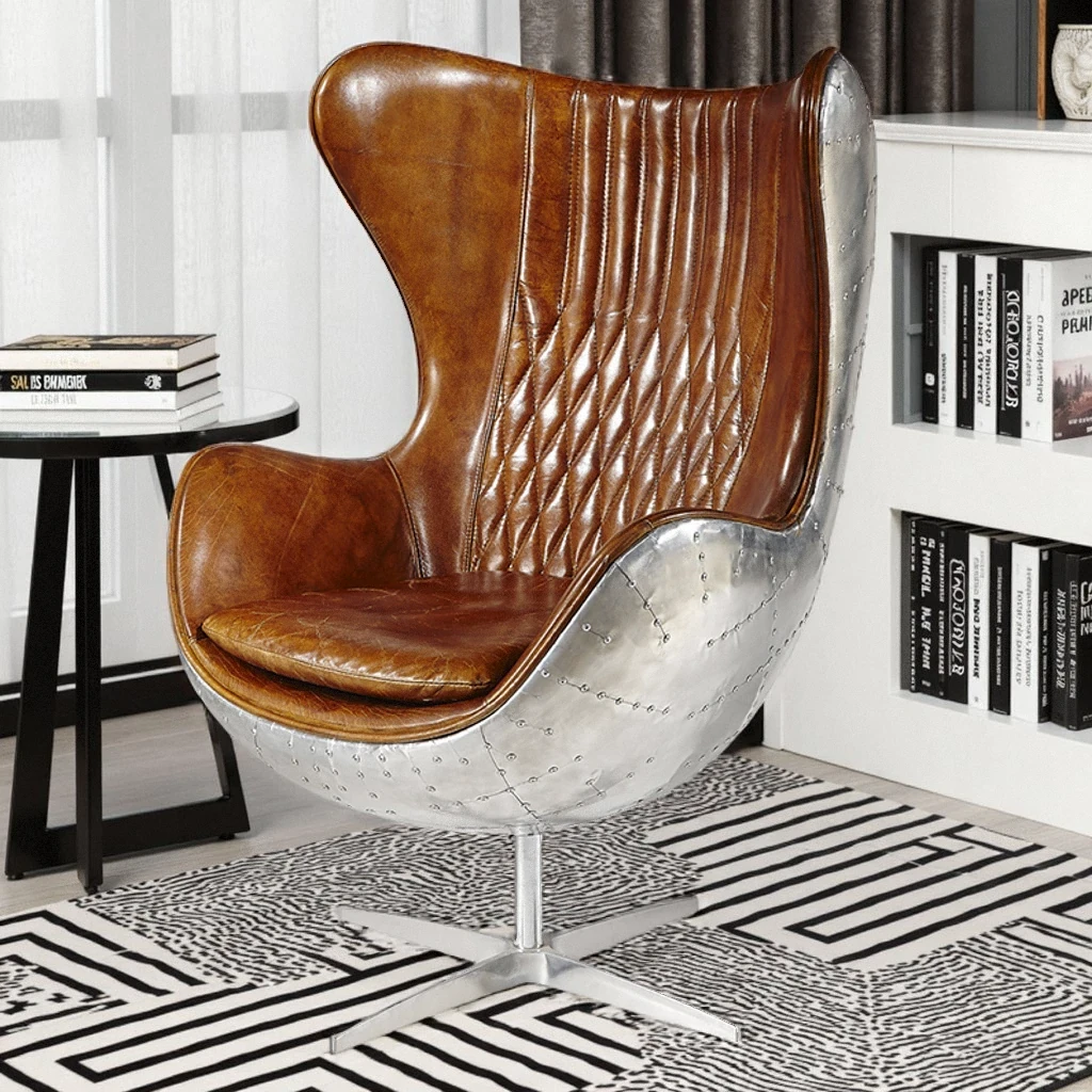 ヴィンテージ風レトロオイルワックスレザーのカジュアルチェア アメリカンカントリー風アルミニウムソファチェア シングルチェア エッグ型回転チェアで、リラックス空間を演出!