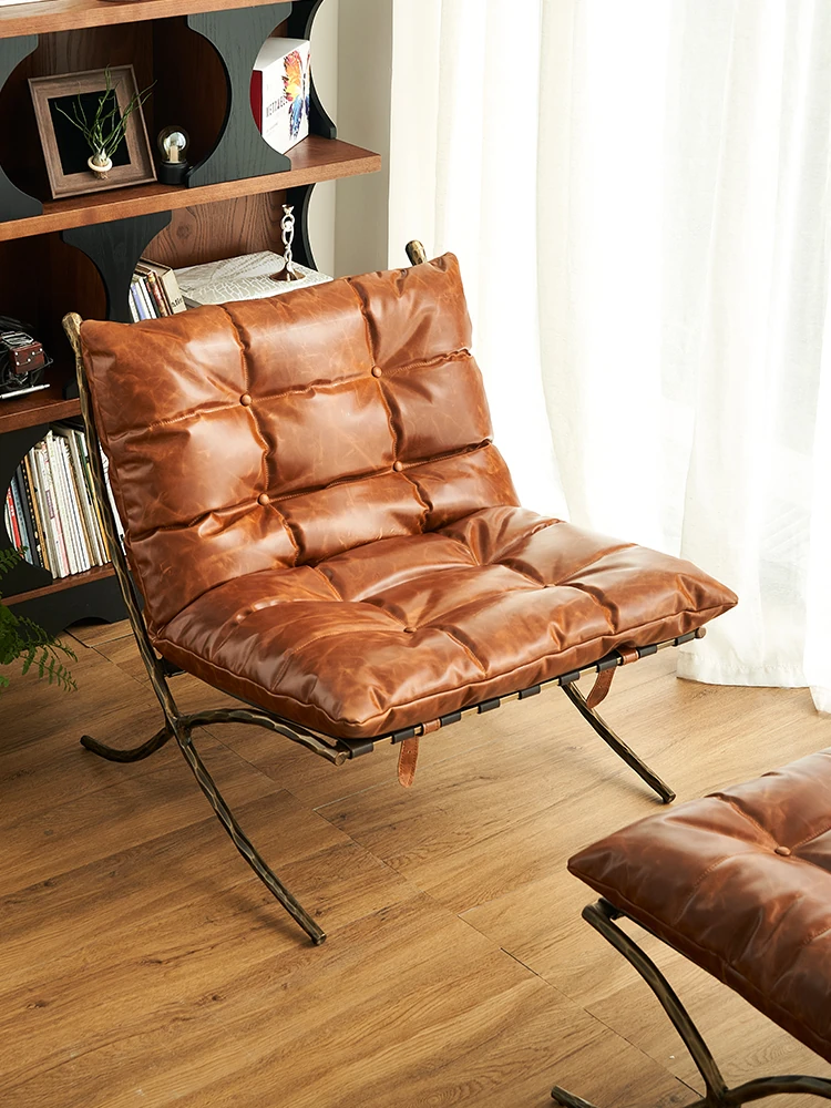 アンティーク風アップグレード版バルセロナチェア 鍛造リラックスチェア ヴィンテージオイルワックスレザー 一人掛けソファ リビングルーム用のラウンジチェア