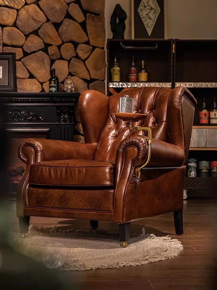1919年製のアメリカンレトロオイルワックスレザー一人掛けソファチェア、ゴッドファーザー椅子、中古カジュアルチェア、フレンチスタイルのタイガーチェア。贅沢な座り心地で、あなたのリビングを格上げ!